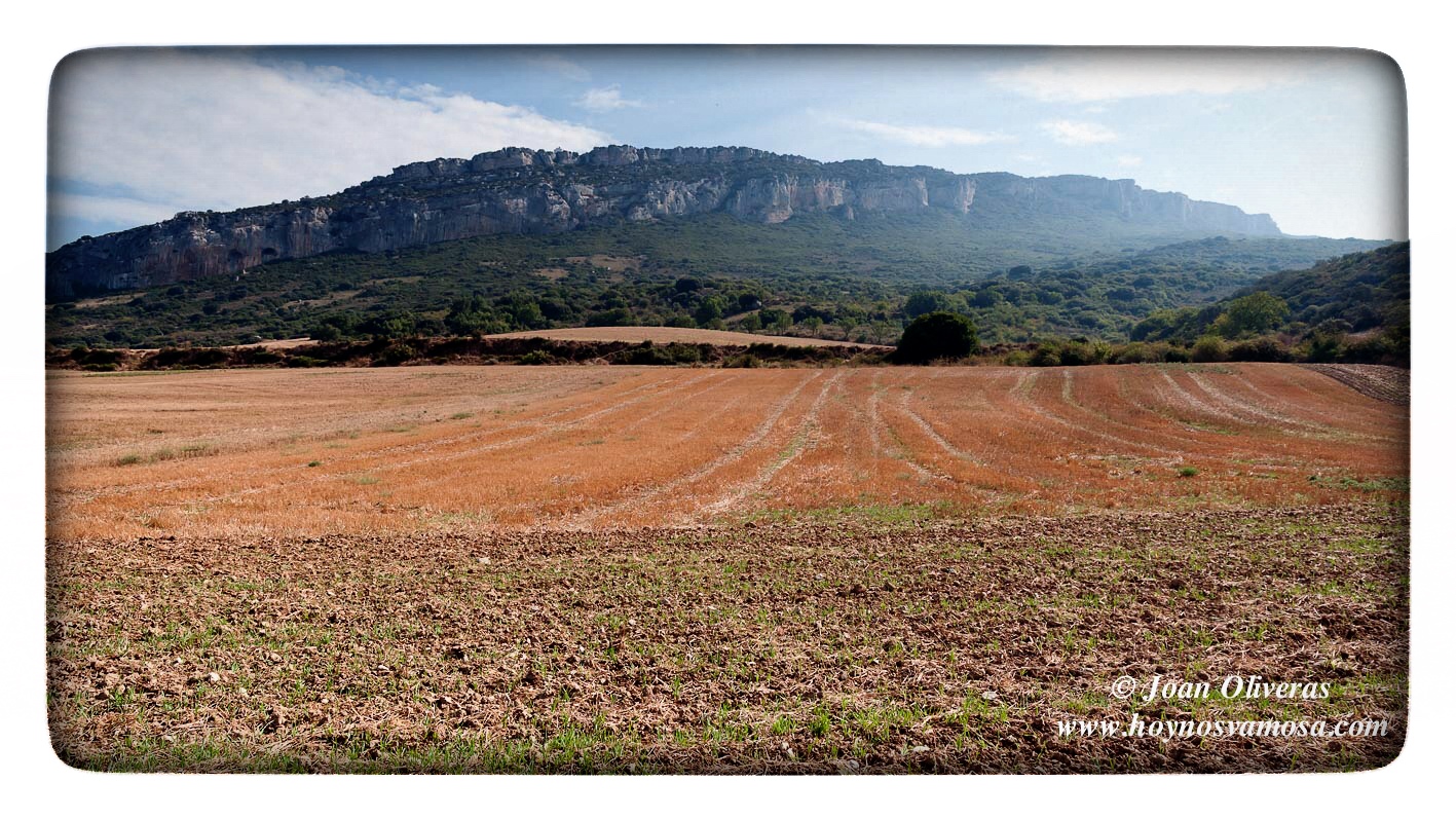Al ir tomando ascensión se aprecia la magnificencia del espacio abierto. Al fondo y detrás de unas tierras de cultivos los cortantes barrancos de la sierra dan cobijo a grupos de buitres. Es fácil verlos en la lejanía planeando sobre los cultivos buscando presas que atrapar. Olores y sonidos nos envuelven mientras el sol cae sobre nosotros sin poder apreciar ningún punto con sombra en todo este espacio. Los primeros sudores comienzan a aparecer. Un paisaje de matorral nos recuerda a espacios mediterráneos. Hace años todo este lugar era lleno de bosques de carrasca pero, paulatinamente, la agricultura fue ganando terreno en este espacio natural. Hoy en día aún se pueden entrever algunos jóvenes ejemplares a ambos lados del sendero. Seguimos ascendiendo suavemente.