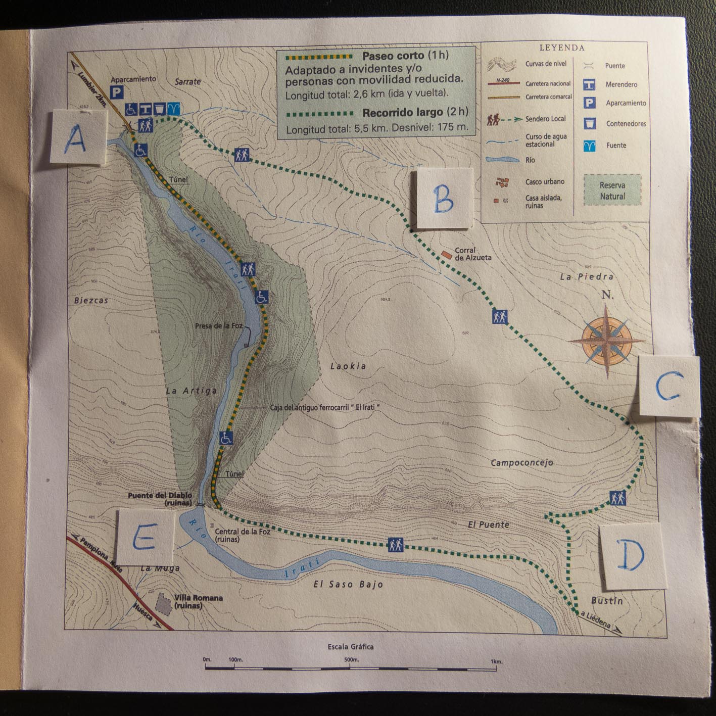Nosotros optamos por realizar el recorrido largo (tomando el aparcamiento como marca A de inicio y final de etapa y cubriendo el recorrido indicado por las diferentes marcas siguiendo el orden alfabético). Hay una parte en que se fusiona con el recorrido corto. En este trayecto, a diferencia del anterior, podemos contemplar el interior de la serranía y el esplendor del río Irati en todo el escenario que se nos muestra. El recorrido total es de unos 5,5 kilómetros con un desnivel de 175 metros. Aunque se suele realizar en dos horas, a nosotros nos gusta hacer paradas para contemplar el escenario, refrescarnos o tomar algún alimento mientras disfrutamos del paisaje. Tampoco perdemos oportunidad de realizar fotografías durante todo el itinerario. De este modo, conseguimos doblar el tiempo previsto. Eso sí, acabamos la etapa totalmente descansados.