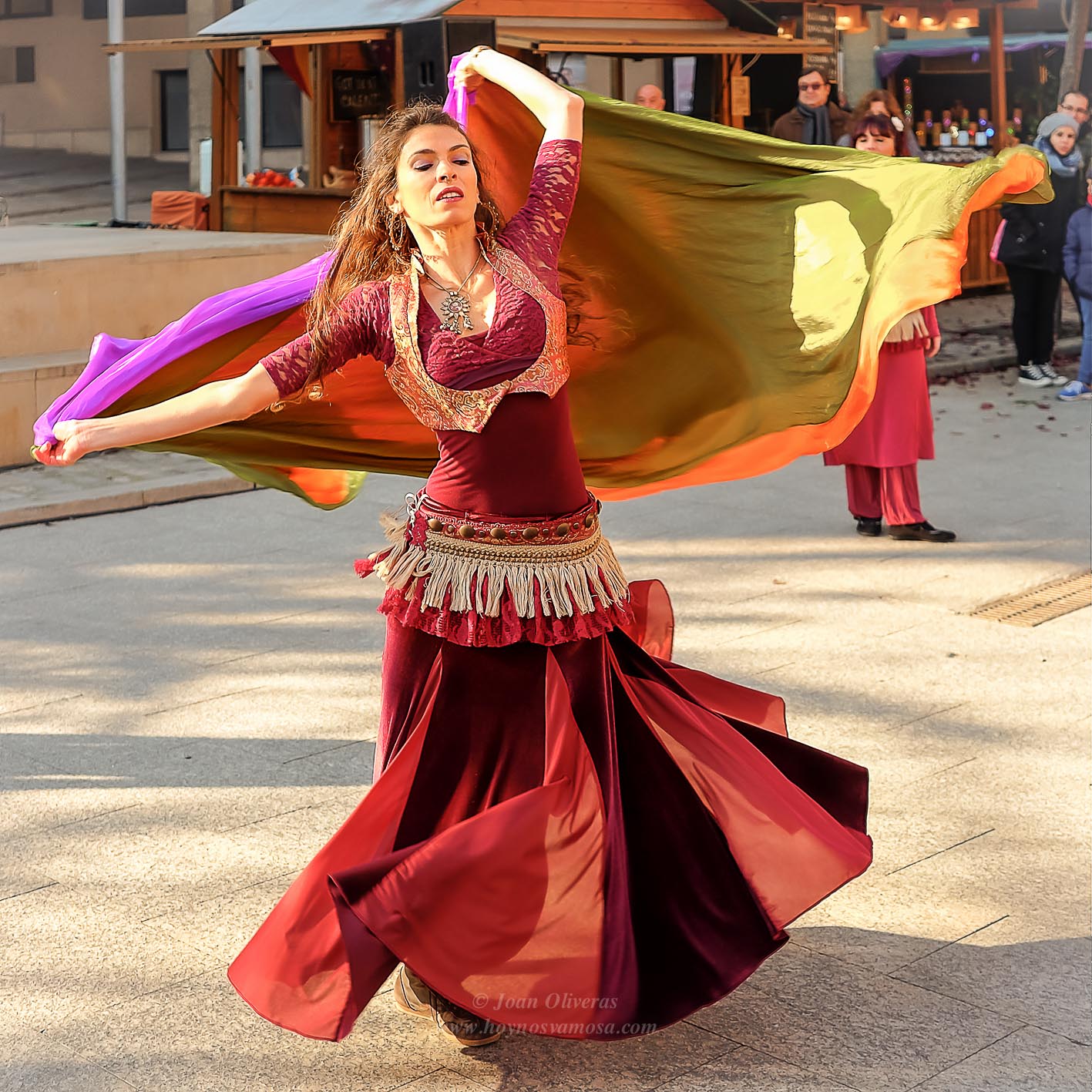 En tiempos de ferias y festivales las calles de los pueblos en donde se celebran se suelen llenar de actuaciones callejeras que deleitan al paseante con bellas coreografías de artes interpretativas. En este caso, nos acercamos a la Feria Medieval de Vic, donde un grupo formado por tres mujeres danzaban con sus coloridas vestimentas al son de una sugerente música oriental. Enseguida se produjo el efecto llamada y las tres quedaron envueltas por curiosas miradas. En la imagen podemos observar una de las tres bailarinas mientras al fondo a la derecha, paseantes y transeúntes ponen atención al trabajo interpretativo de la artista.
