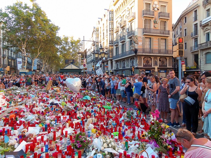 Transitando por La Rambla me encuentro con diversos memoriales improvisados que honran el recuerdo y la memoria de las víctimas. Son espacios situados sobre la misma acera donde se depositan sentidos y emocionados mensajes, donde velas y cirios proveen de luz a muchos sentimientos vertidos, donde bellas y hermosas flores ofrecen frescos colores frente a la oscura desgracia, y donde tiernos peluches y otros muy diversos objetos simbolizan la tristeza por la pérdida de seres queridos.