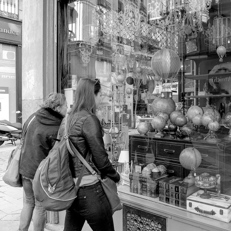 En nuestro recorrido por la madrileña Calle del Arenal, calle peatonal repleta de tiendas, los escaparates muestren bellos objetos con que atraer la vista de los que por allí transitan. Y si eso conlleva la entrada a la tienda es posible que la venta sea efectuada.