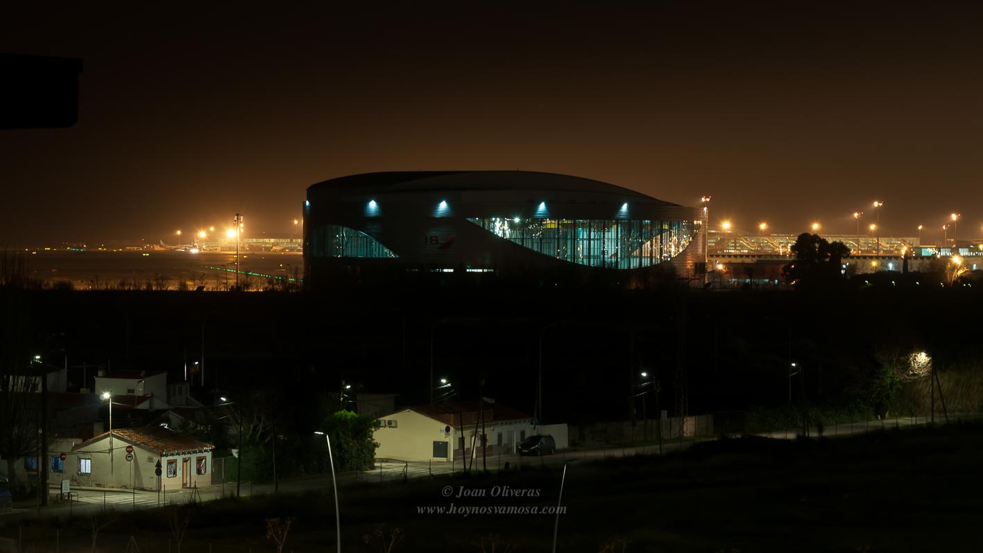 La imagen está tomada en una fría noche invernal desde el exterior del aeropuerto de Barcelona-El Prat. En su parte inferior se muestra el Barrio de las Palmeras sito en el municipio de El Prat de Llobregat.