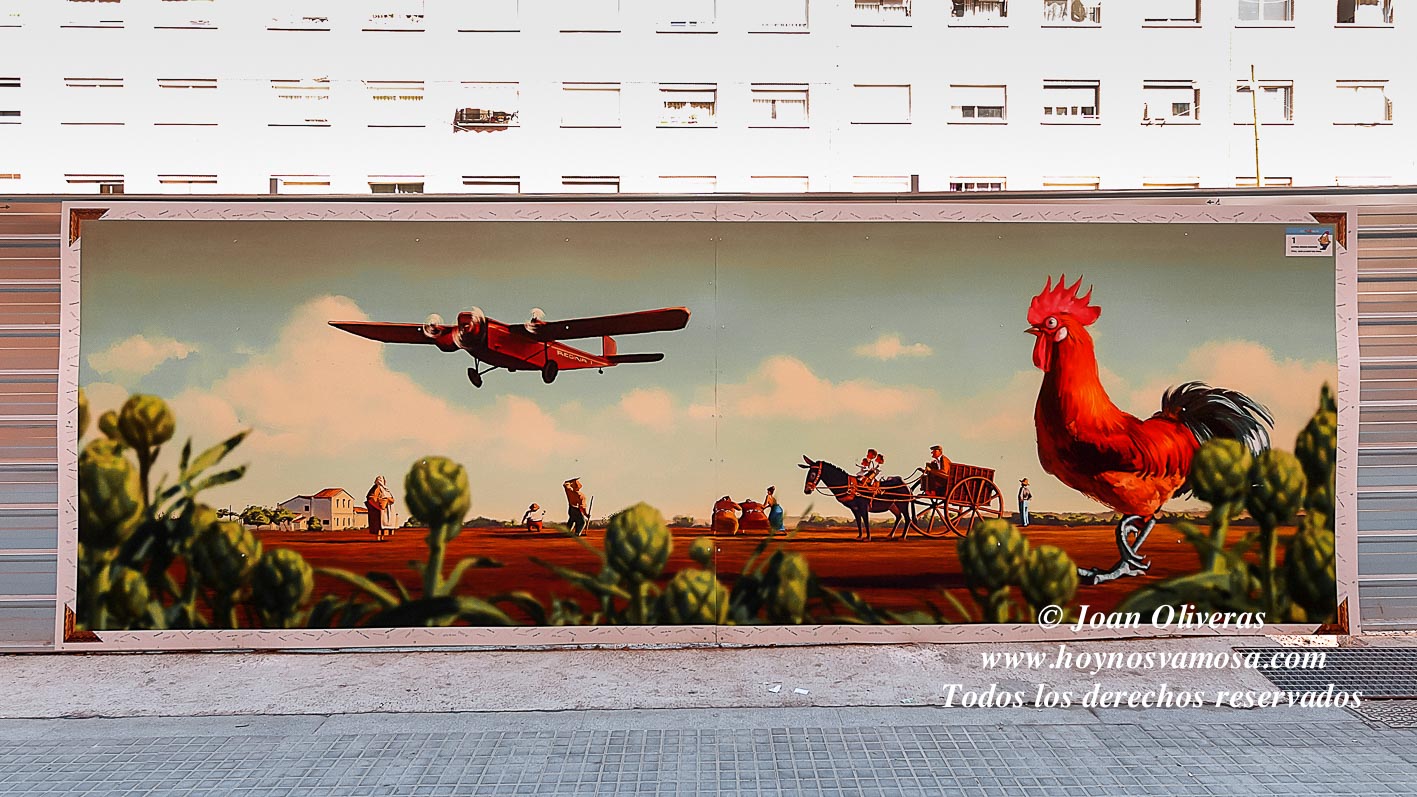 La autora del mural se pone en el barro para realizar un bello retrato ambientado en las primeras décadas del siglo XX en el que la agricultura era la base económica del pueblo (en aquellos días a El Prat de Llobregat le quedaban todavía muchos años para convertirse en la ciudad que es actualmente). En ese paisaje comenzaban a aparecer sobre nuestros cielos los primeros aeroplanos que despegaban o aterrizaban de alguno de los diversos aeródromos trazados en las tierras donde actualmente se encuentra el Aeropuerto de Barcelona-El Prat.