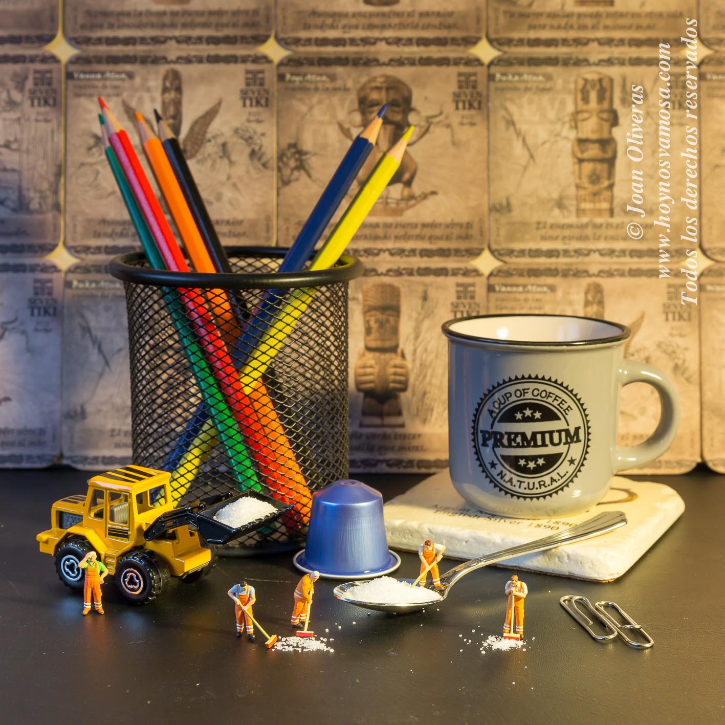 Hoy os presentamos otra muestra de un sencillo diorama elaborado sobre el tapete de nuestro escritorio de trabajo. En esta ocasión la acción evoca la necesidad de suministrar azúcar al organismo a través de un buen café y de mantener limpia la superficie del escritorio de restos del alimento.