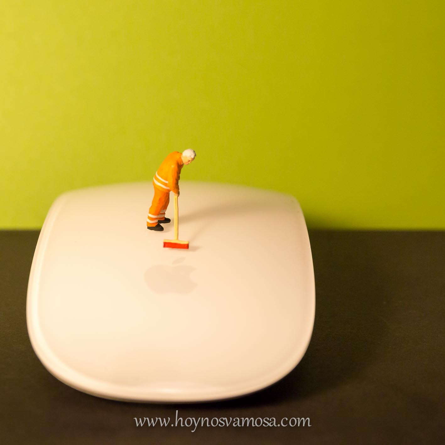 En la imagen un operario de la limpieza a punto de llevarse por delante uno de los grandes iconos del mundo informático. La famosa fruta newtoniana no pasa desapercibida por más que le salgan competidores a diestro y siniestro.