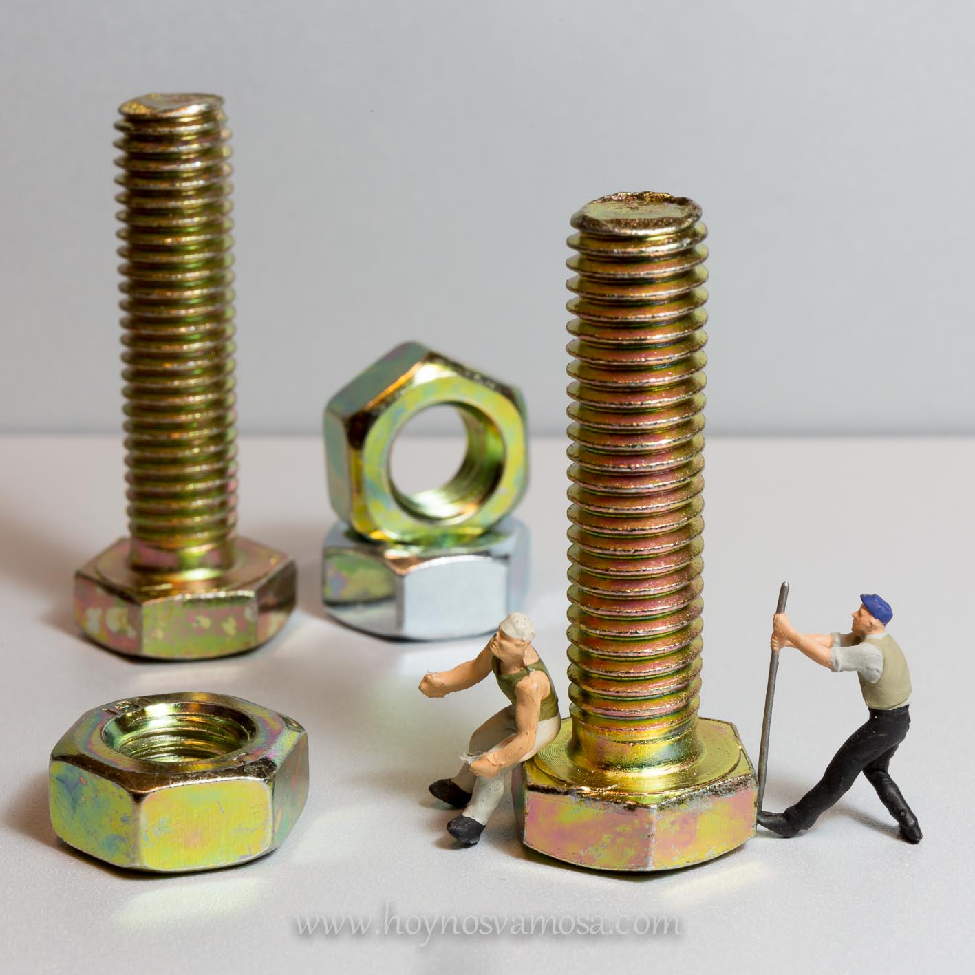 Mientras un operario descansa, el otro realiza un esfuerzo para sacar adelante el trabajo. ¿Podrá hacer este último palanca para levantar la columna formada por el tornillo y, de este modo, poner en pie a su compañero de faena? Quién sabe.