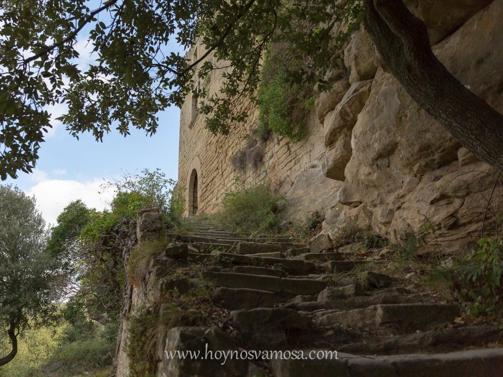 Por fin alcanzamos el final del recorrido dándonos de bruces contra los restos de lo que antaño fue una monumental escalinata de piedra que nos encarama hasta la entrada principal del castillo románico.