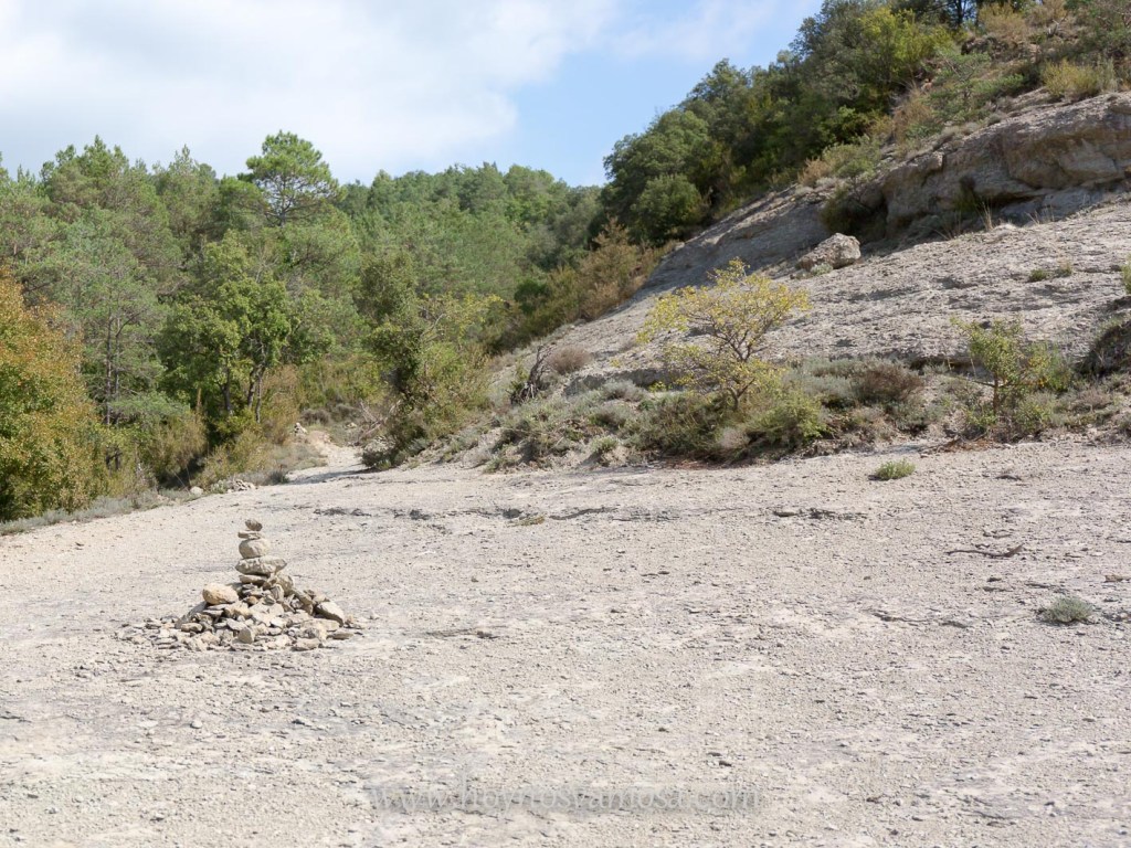 Después de recorrer aproximadamente un kilómetro de pista forestal, ésta cambia su pavimento a tierra por donde continuamos descendiendo hasta alcanzar la Riera de Castellcir donde nos encontramos con un espacio abierto rocoso en el que varios vehículos particulares se encuentran aparcados.