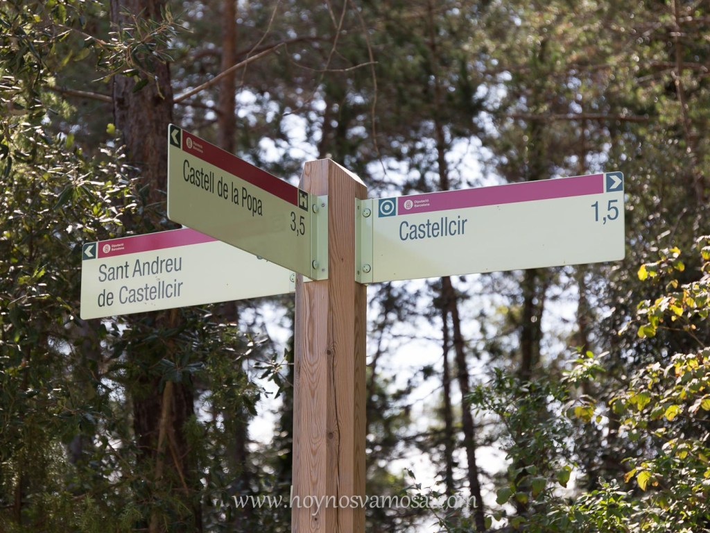 Aquí, un poste con señalización nos marca diferentes itinerarios y sus distancias. Así, la distancia recorrida hasta el momento es de 1,5 km desde Castellcir. Desde aquí un desvío del camino nos lleva hasta la iglesia de San Andrés de Castellcir (siutada a tan sólo 0,6 km y de la que ya podemos vislumbrar su fisonomía desde este punto) y si continuamos rectos, nuestro destino queda a 3,5 kilómetros. Este último es el itinerario que realizaremos. En este punto recomendamos leer la Nota 1 que aparece al final de este texto.